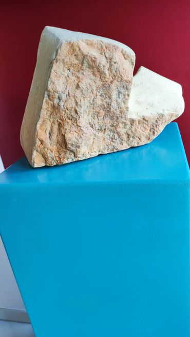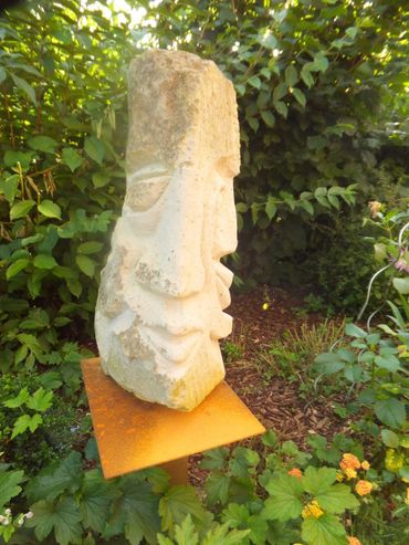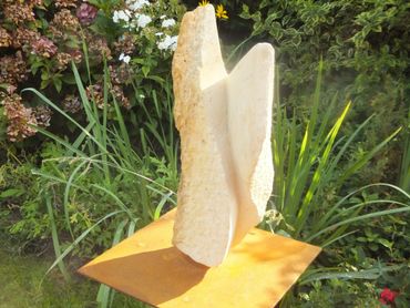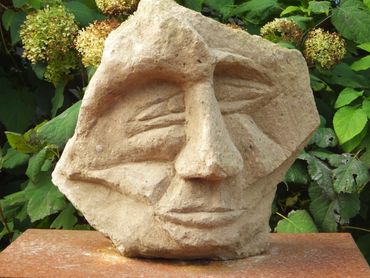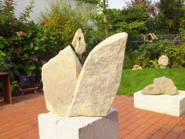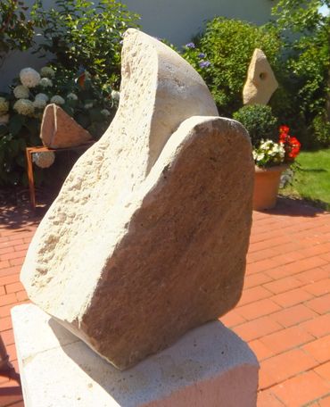 Seit 2011 fahre ich zum „Steine kloppen“ nach Dresden zur Sommerakademie. Dort gibt es den farblich sehr unterschiedlichen Elbsandstein. Jeder Stein sagt mir, was er werden will. Entweder ein Kopf oder ich finde beim Bearbeiten mit Hammer und Meißel eine abstrakte Form. Lässt man seiner Fantasie freien Lauf, kann jeder darin auch einiges entdecken z.B. einen Hut, einen Vogel, eine Burg…